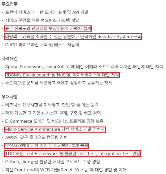 대용량 트래픽 처리를 위한 Reactive System / Elaticsearch / Nosql 기술 스택 언급으로 트래픽 처리에 대한 경험이 없었다면 점프하기 좋은 경험을 쌓을 수 있을 거라 생각합니다.