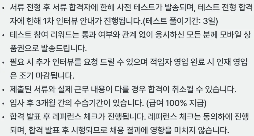 서류 전형 → 사전 테스트 → 1차 인터뷰 - > 2차 인터뷰 → 최종 합격