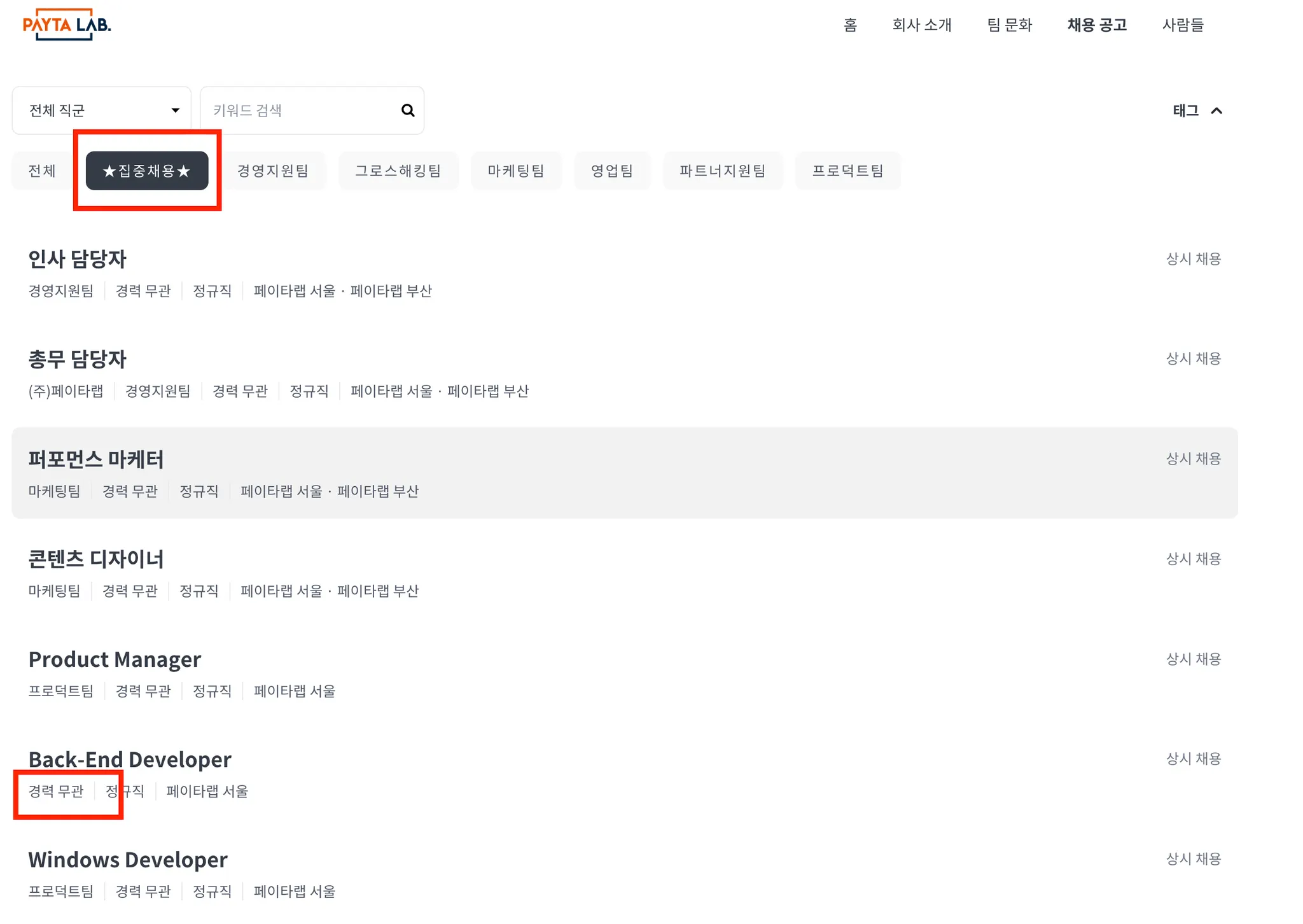 현재 굉장히 많은 공고가 열려 있고 Back-end 포지션이 집중 채용중이며 경력무관으로 포트폴리오 퀄리티가 괜찮은 취준생 분들에게는 좋은 기회로 보입니다.