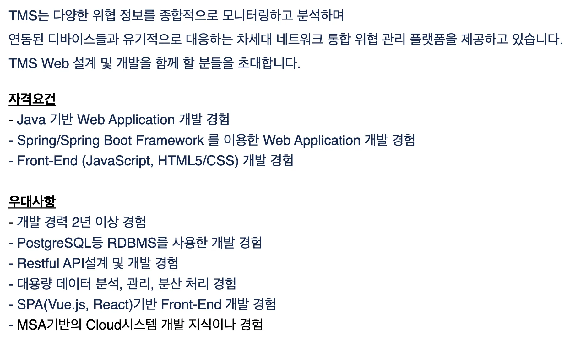 MSA 환경 대용량 데이터 분석등에 관련된 업무라면 신입한테는 좋은 경험이 될거라 생각합니다.