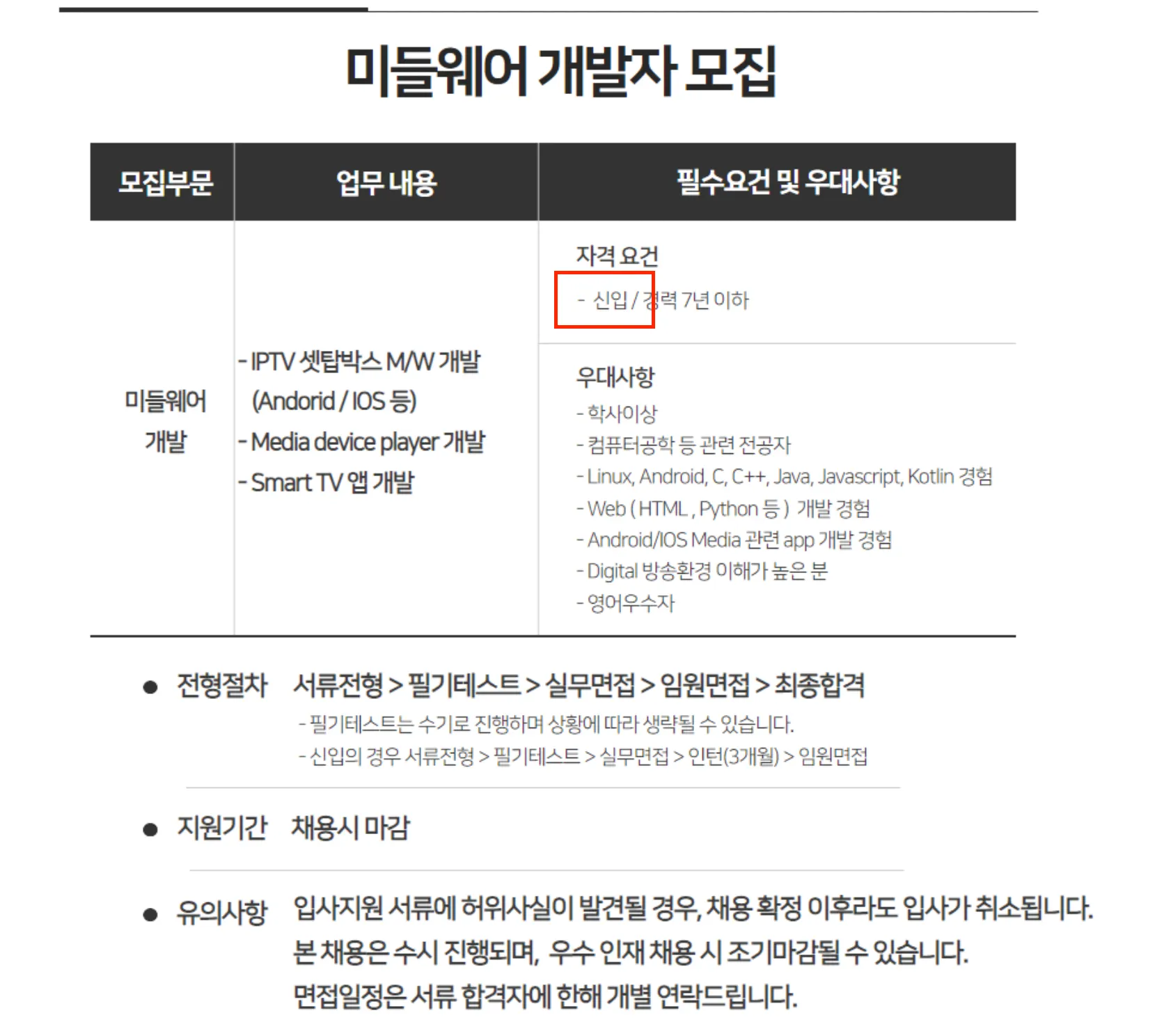 유의 사항 : 입사지원 서류에 허위사실이 발견될 경우, 채용 확정 이후라도 입사가 취소됩니다. 본 채용은 수시 진행되며, 우수 인재 채용 시 조기 마감될 수 있습니다. 면접일정은 서류 합격자에 한해 개별 연락드립니다